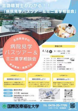 高校生を対象とした「病院見学バスツアー&ミニ進学相談会」を開催いたします。言語聴覚士に興味をお持ちの方はぜひご参加ください。 お申し込みはこちら