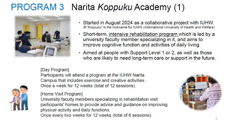 本学では、成田市より委託を受け、本事業を「成田こっぷくアカデミー」と冠して昨年度より運営しています。理学療法および作業療法の専門性を最大限に活かし、以下の3つの柱を中心に、1回2時間・週1回のリハビリテーションを3ヶ月間にわたり提供しています。